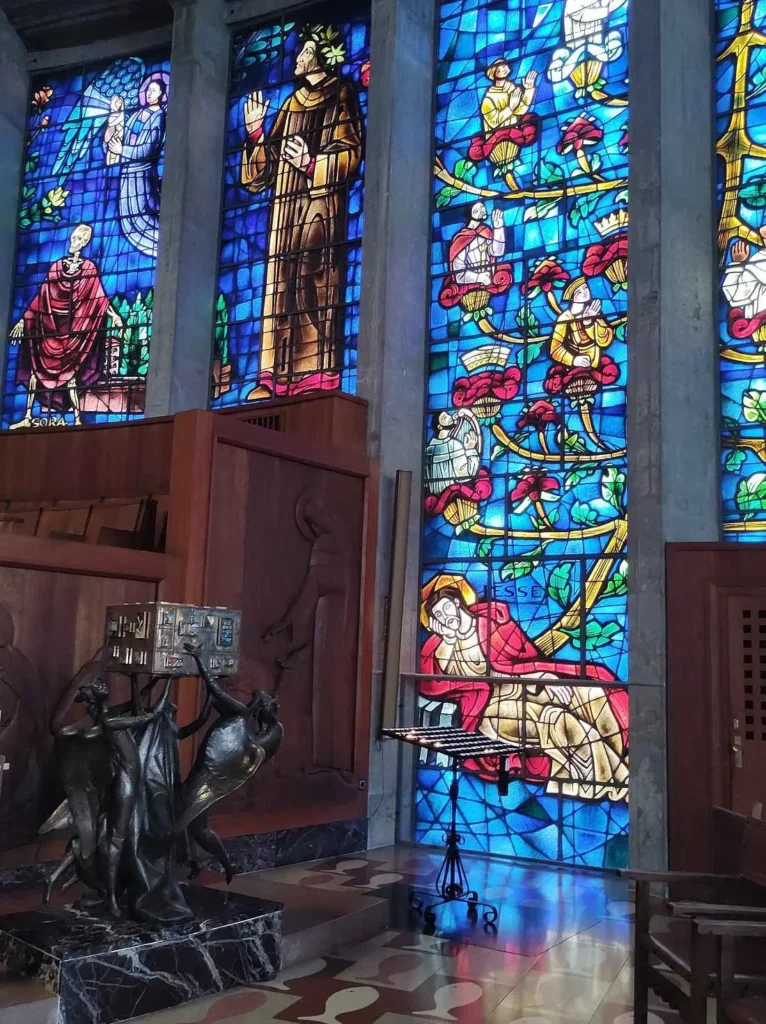 Las vidrieras, diseñadas por Juan Bautista Castro, reflejan los principios de naturaleza y cosmos que caracterizan el pensamiento de la orden franciscana. Las imágenes en las vidrieras están combinadas tanto con escenas bíblicas como con representaciones de la vida de San Francisco.