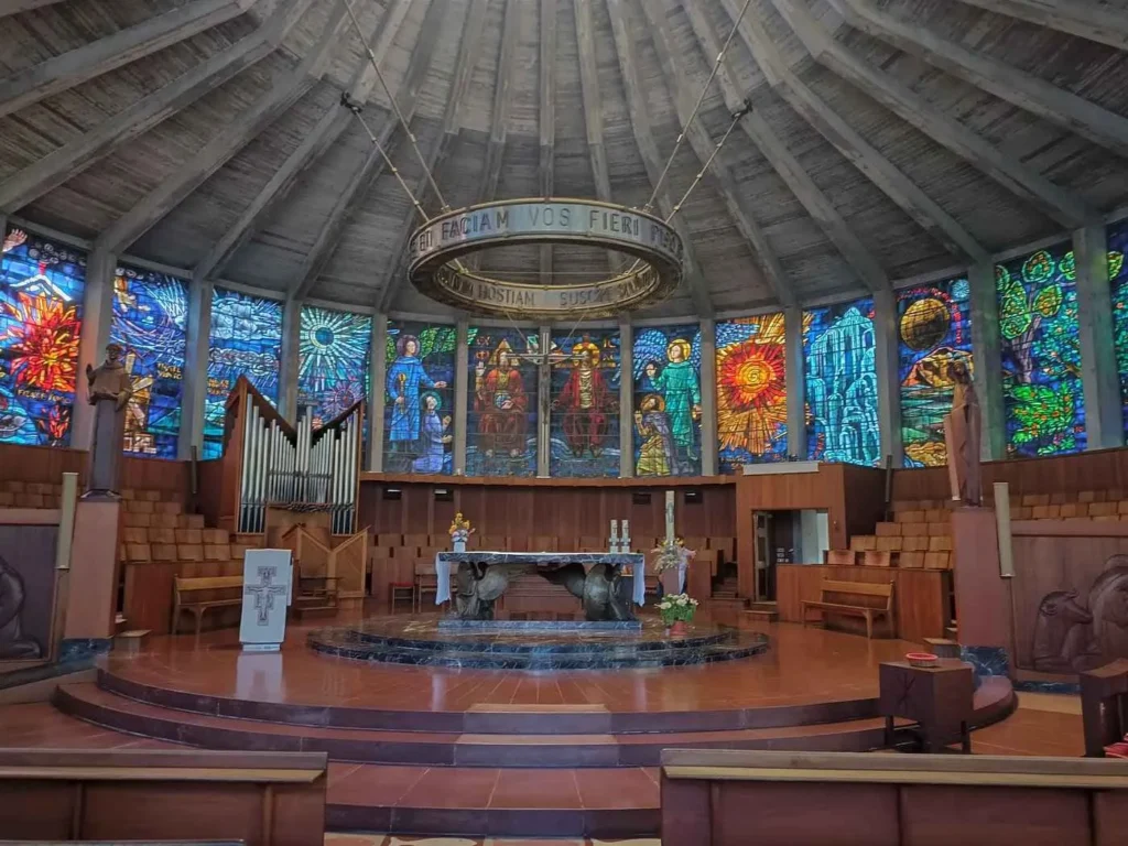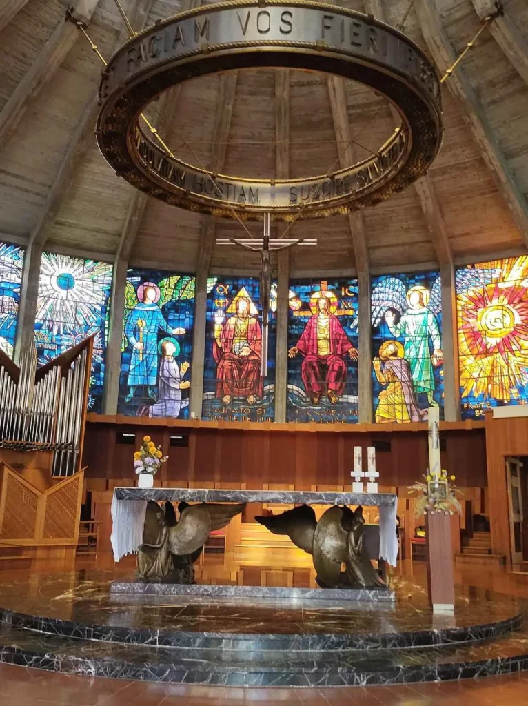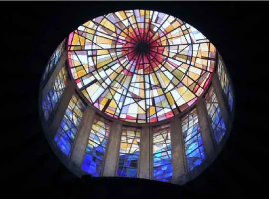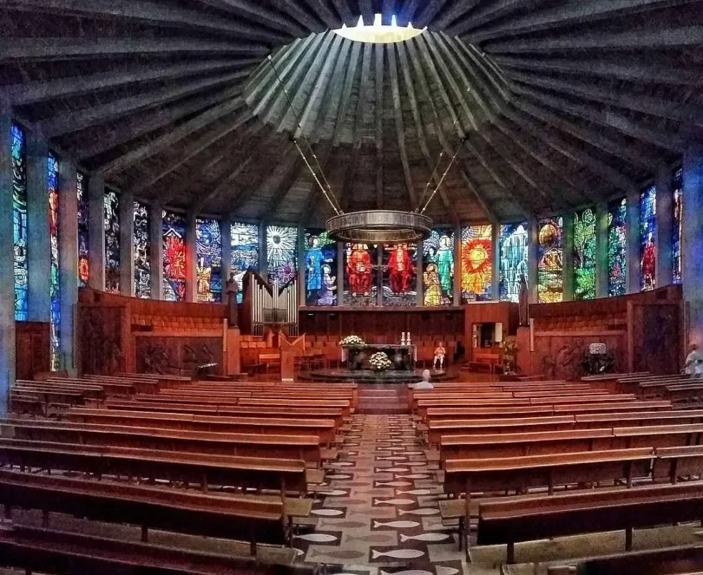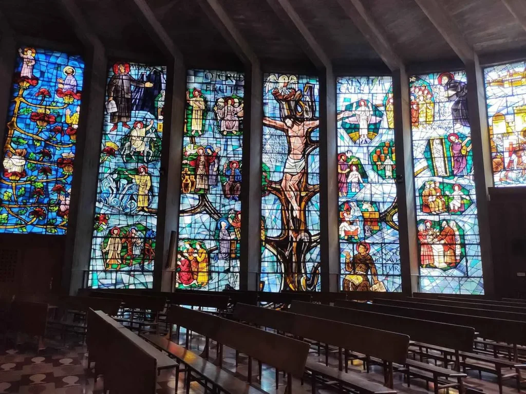 Existe un contraste notable entre el interior y el exterior de la iglesia. Desde el exterior, la iglesia parece ser una construcción más tradicional, donde el hormigón tiene primacía. Sin embargo, el interior de la iglesia ofrece una atmósfera creada a partir de un juego de luces y de colores, proporcionado por las vidrieras.